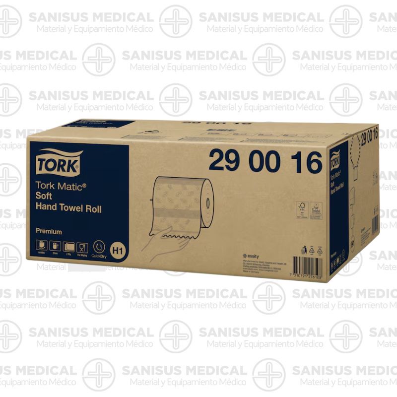 Las toallas de mano en rollo Tork Matic Premium, ideales para aseos donde la imagen es importante, son suaves y vienen decoradas con un bonito gofrado de una hoja azul. Secan las manos de forma rápida y eficaz gracias a la calidad QuickDry. Los rollos pueden utilizarse con Tork Matic® Dispensador para Toalla de Mano en Rollo, diseñado para facilitar las tareas de mantenimiento en aseos con mucho tránsito. Ahorra tiempo y controla el consumo gracias a la dispensación individual.