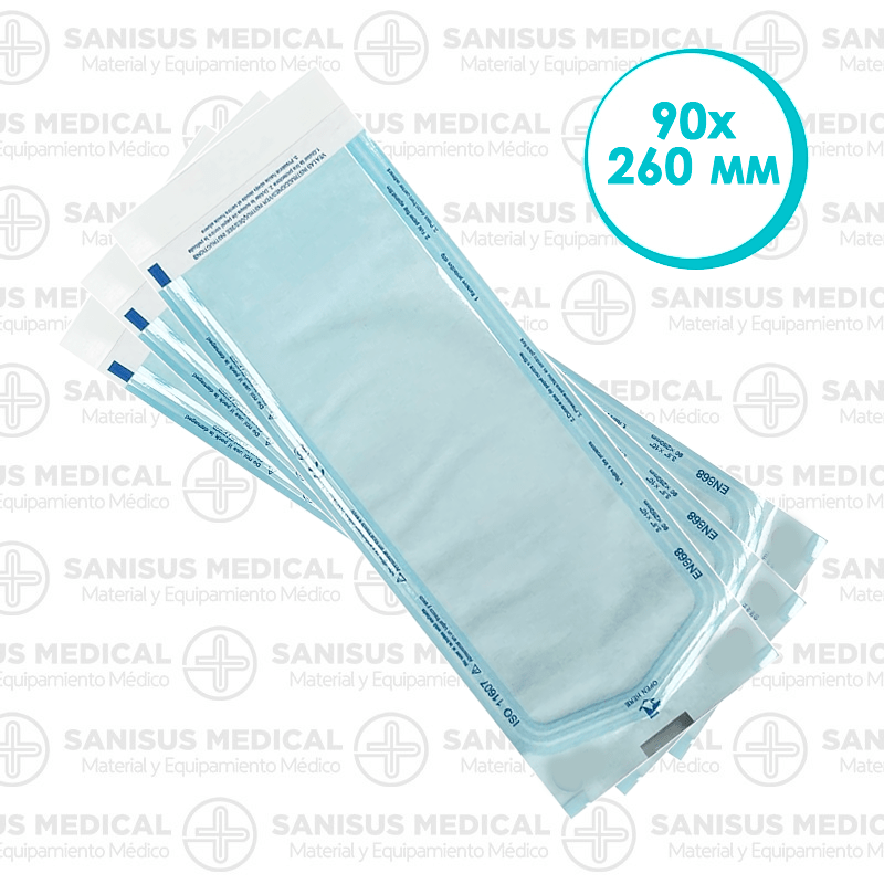 Bolsas de esterilización 90 x 260mm para autoclave con cierre adhesivo y testigo de esterilización. Compuestas de una cara de papel (donde penetra el vapor) y otra cara de plástico (que mantiene la esterilidad).
