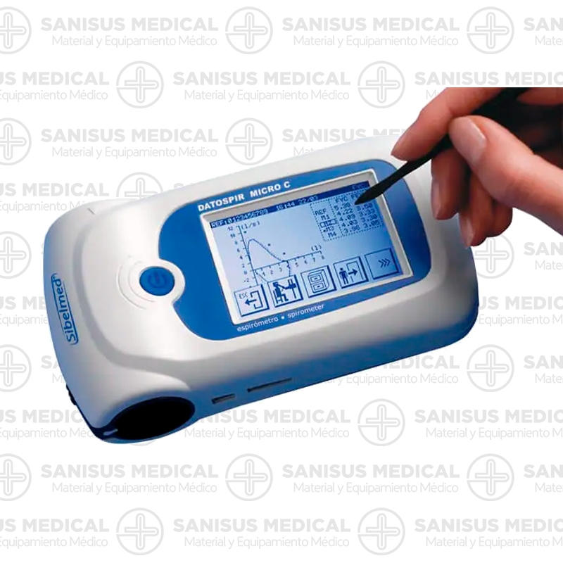 Espirómetro portátil Sibelmed Datospir Micro C, es un espirómetro portátil que tiene la posibilidad de agregar los sistemas de comunicación (USB y BLUETOOTH) y pantalla táctil en su modelo C. Dispone de maletín robusto y batería de larga duración para la realización de espirometrías en cualquier entorno.