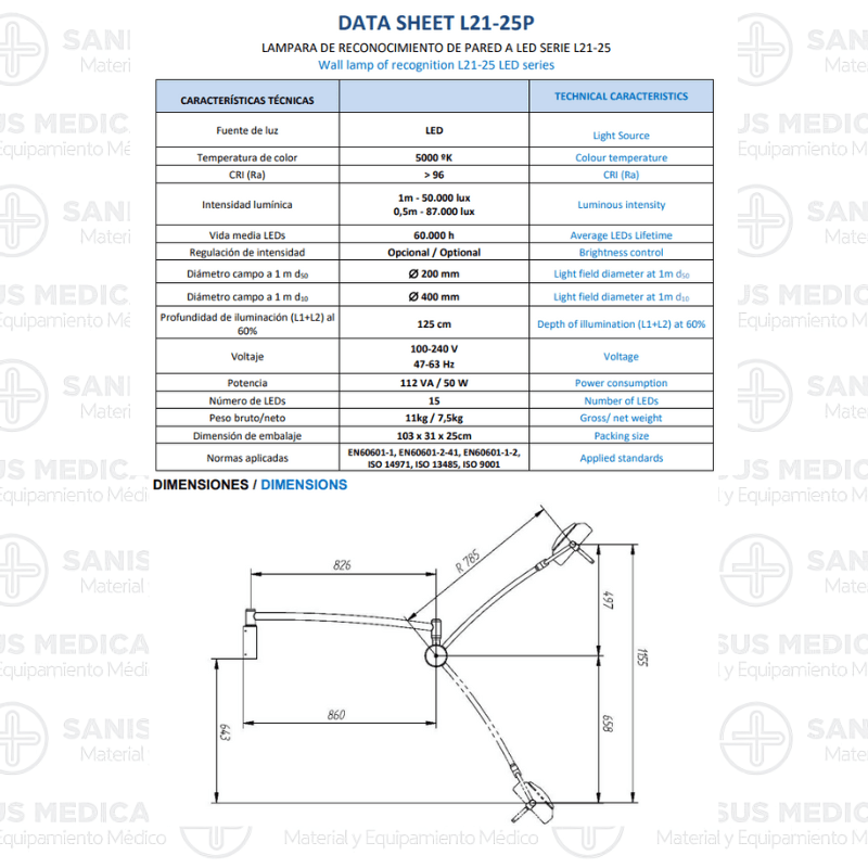 La Lámpara con soporte a pared LED L21-25P con soporte mural ofrece una iluminación médica potente, eficiente y de alta calidad, ideal para clínicas, consultorios y hospitales. Gracias a su tecnología LED de última generación, proporciona una luz fría sin radiación infrarroja, con una excelente reproducción cromática y un bajo consumo energético.