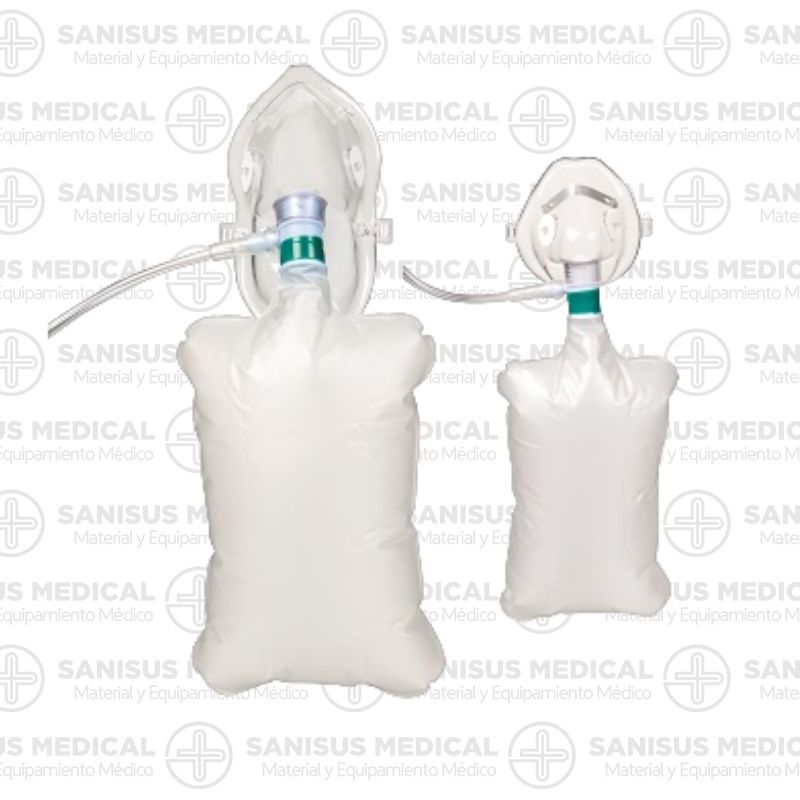 Se trata de un sistema de bajo flujo pero de alta concentración gracias a la bolsa reservorio de PVC que incorpora (capacidad 1.000 ml.). El tubo de 2 m. lleva un estriado interior anticolapso, lo que impide su obstrucción por acodamiento. La mascarilla incorpora unas válvulas laterales unidireccionales que permiten la salida de la exhalación e impiden la entrada de aire ambiente en la inhalación.