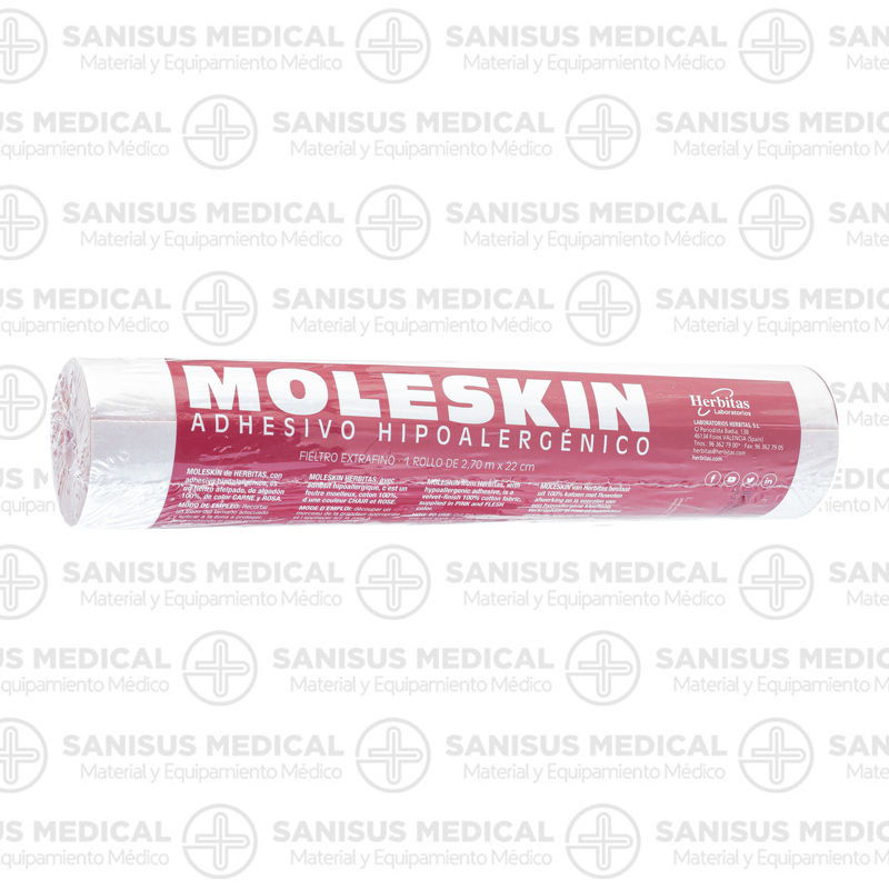 Moleskin de Herbitas es un fieltro adhesivo muy delgado (de solo 0,5 mm de grosor) en formato rollo de 2,70 x 0,22 metros.
