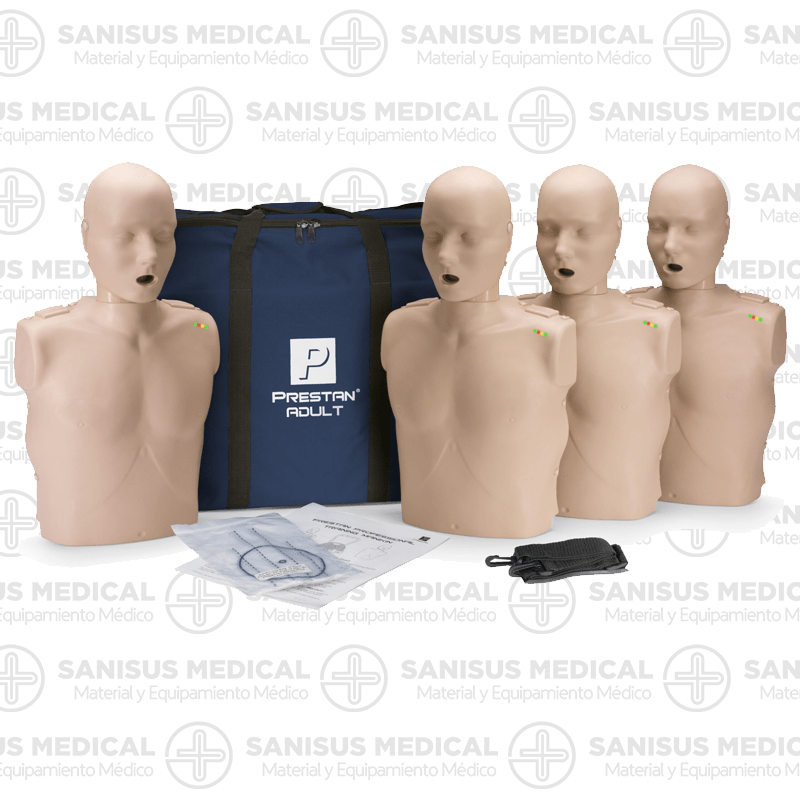 Pack de 4 maniquíes profesionales de RCP Adulto con monitor de la firma Prestan®, especialmente diseñados para la formación y entrenamiento de la técnica de resucitación cardiopulmonar. Poseen el máximo realismo tanto a la vista como al tacto. Cada uno de ellos posee un monitor luminoso de la frecuencia de las compresiones torácicas a fin de indicar tanto al profesor como al alumno si las mismas se están realizando con el ritmo adecuado. Permite la maniobra frente-mentón para apertura de vías aéreas y respiración boca o boca.