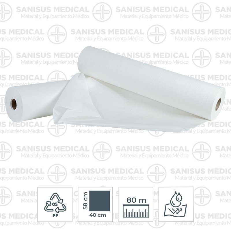 Rollo polipropileno plastificado de 58 cm X 80 mts, es el más resistente a todo tipo de tratamientos, el plástico retiene los líquidos y hace que no pasen a la camilla.