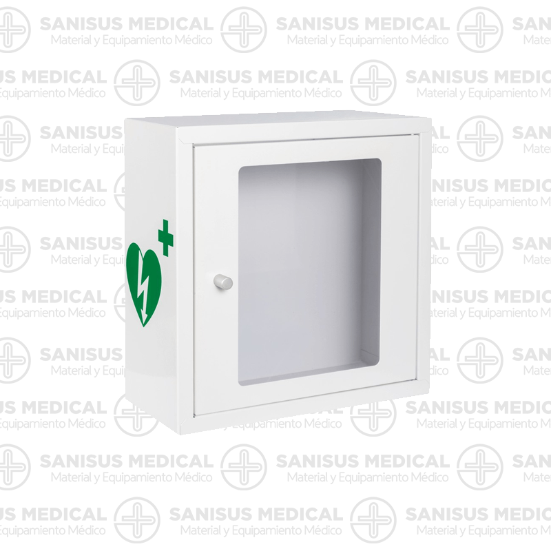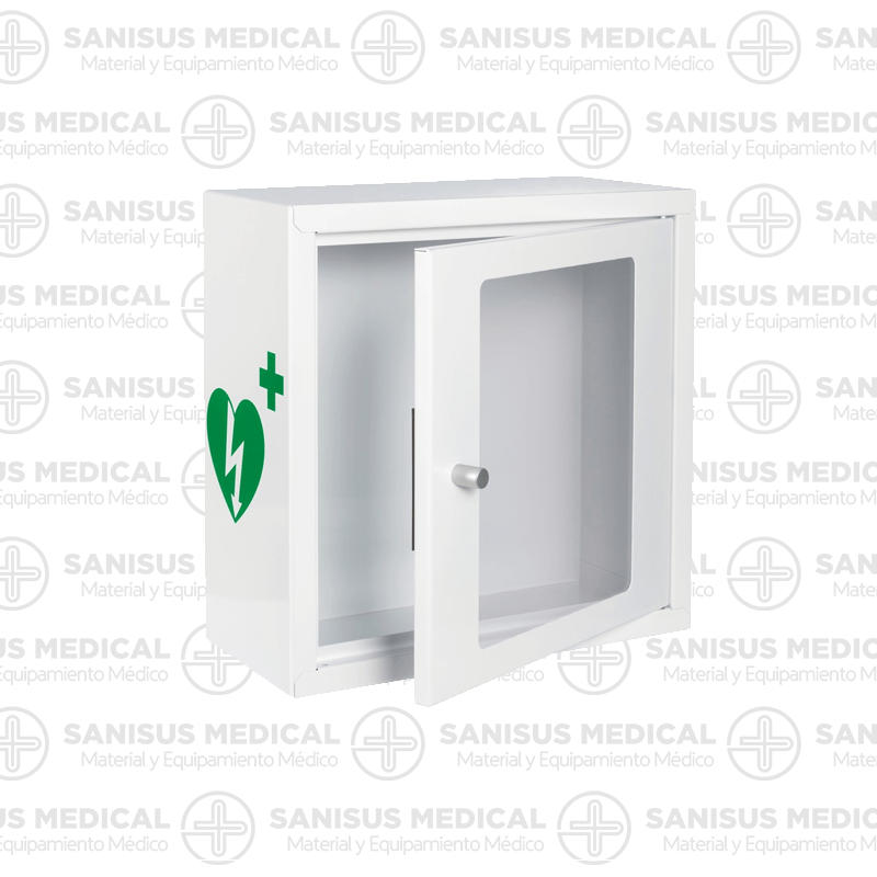 Vitrina metálica compacta de fuerte construcción con cierre con imán. Apta para prácticamente todos los desfibriladores del mercado.